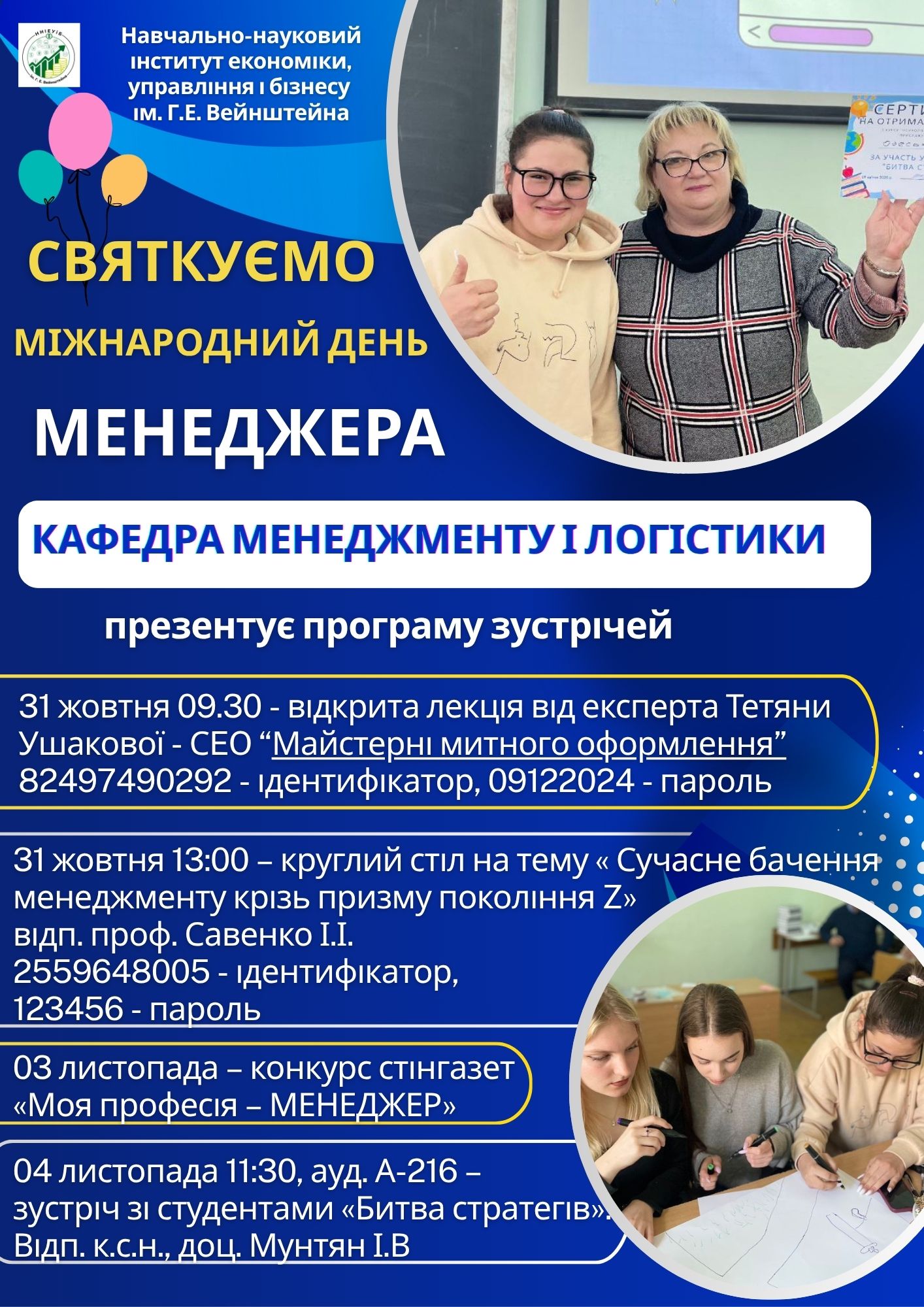 October 30, 2025В рамках святкування Міжнародного дня Менеджера кафедра Менеджменту і логістики провела серію заходів, до яких були залучені викладачі та студенти...
